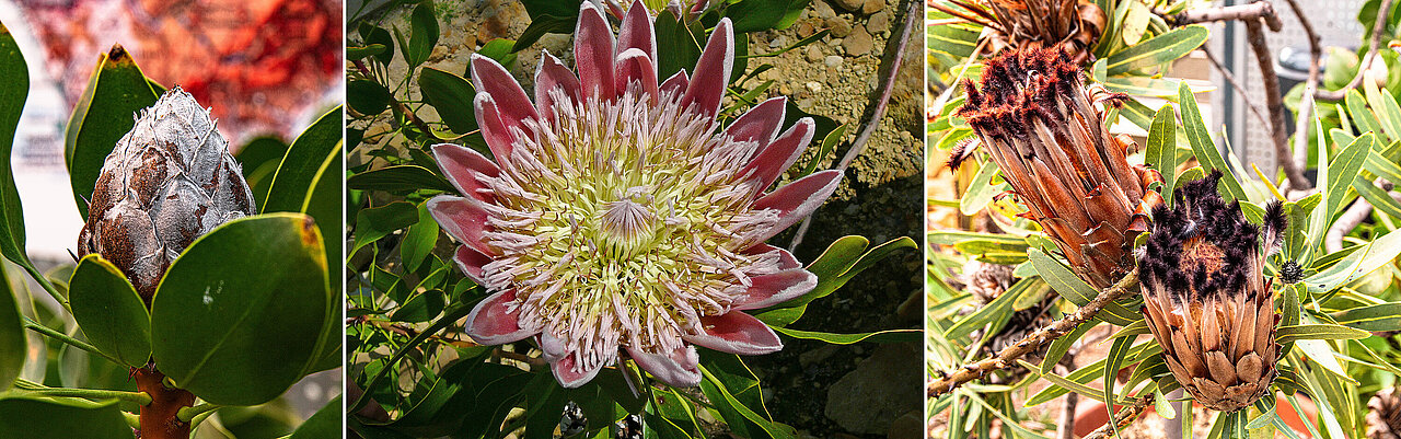 Die Königs-Protee (Protea cynaroides) schließlich ist wegen ihrer Schönheit die Wappenblume Südafrikas. Ihr Blütenkopf besteht aus einer Vielzahl von Einzelblüten, die von Nagetieren, Vögeln und Insekten bestäubt werden können. Proteen sind durch ihre hartlaubigen Blätter ebenfalls gut an Trockenheit angepasst. Darüber hinaus haben sie Schutzmechanismen entwickelt, um auch natürliche Feuer zu überstehen. Sie gehören damit zu den sogenannten Pyrophyten.