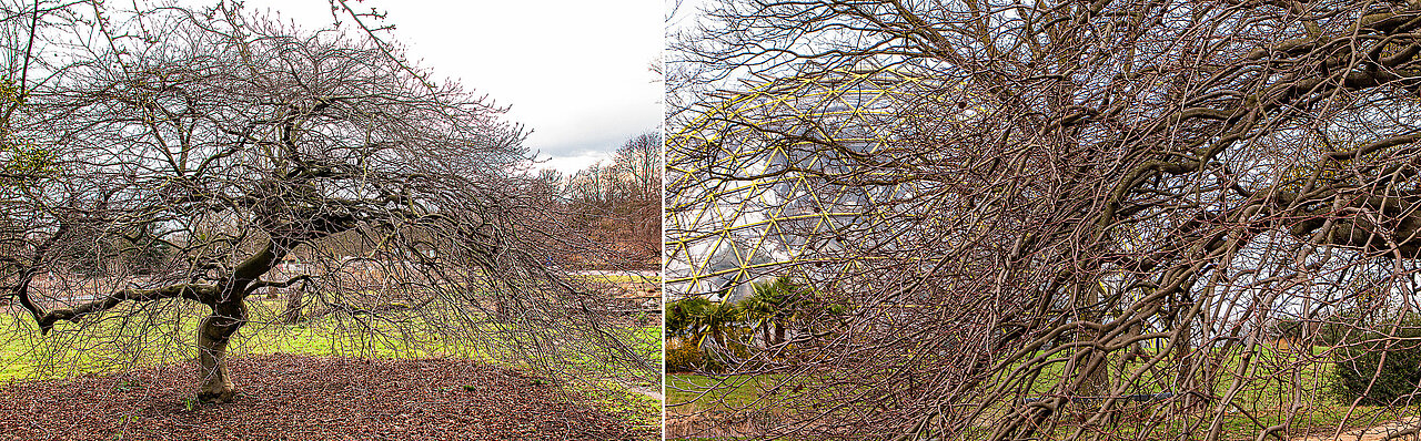 „Spannend ist jetzt der Blick ins Geäst der kahlen Laubbäume,“ sagt Dr. Sabine Etges, wissenschaftliche Leiterin des Botanischen Gartens, „denn jetzt erkennt man die Struktur des Geästs und des Stamms sehr gut. Dies fällt besonders bei der Süntelbuche (Fagus sylvatica ‚Tortuosa‘) auf.“ Der wissenschaftliche Beiname bezieht sich auf ihren windungsreichen Wuchs: vom lateinischen „tortuosus“, übersetzt „voller Windungen“. Der deutsche Name weist auf einen Höhenzug im Weserbergland hin, in dem es bis Mitte des 19. Jahrhunderts einen großen Wald mit diesen Buchen gab.