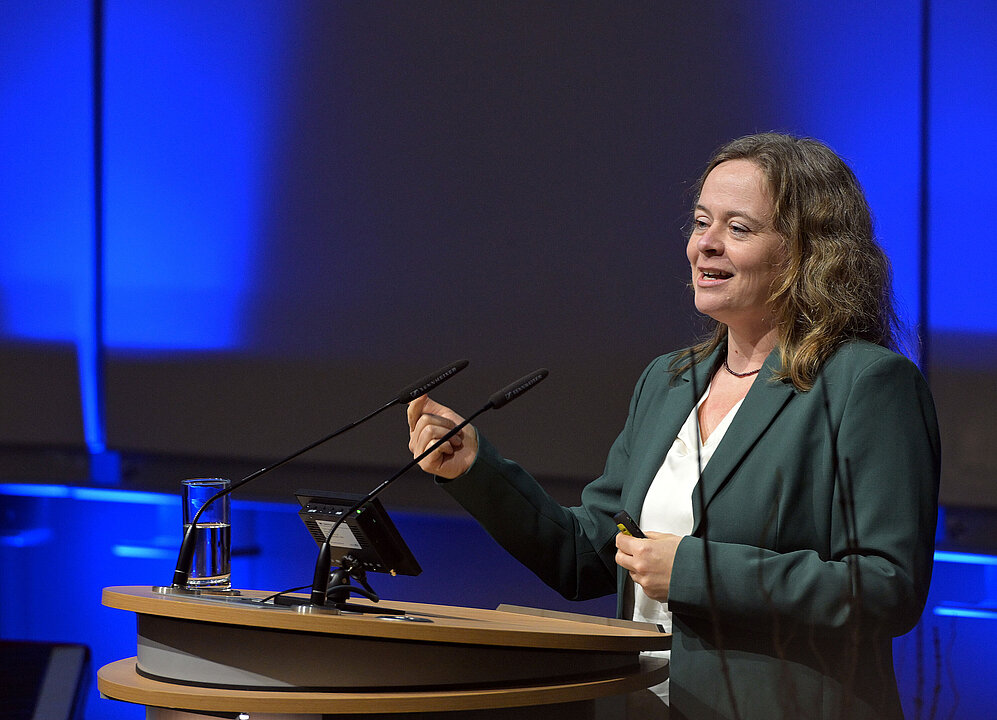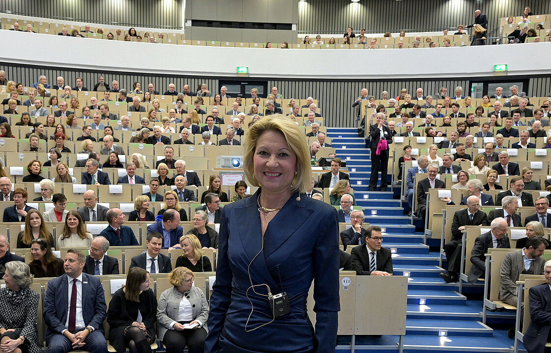 Die Universitäten bildeten einen Gegenpol zu Gefühlen und Wahrnehmungen. Wissenschaftliches Vorgehen sei von Objektivität und Sachlichkeit geprägt, „Vorurteile, Ideologien und Glaubensätze haben hier keinen Platz.“ Mit ihrer Forschung, so die Rektorin, sind Universitäten Zukunftswerkstätten der Gesellschaft. Sie sind ein wichtiger Akteur, wenn es darum geht, Lösungen für gesellschaftliche Herausforderungen zu finden und den Wohlstand zu sichern.
