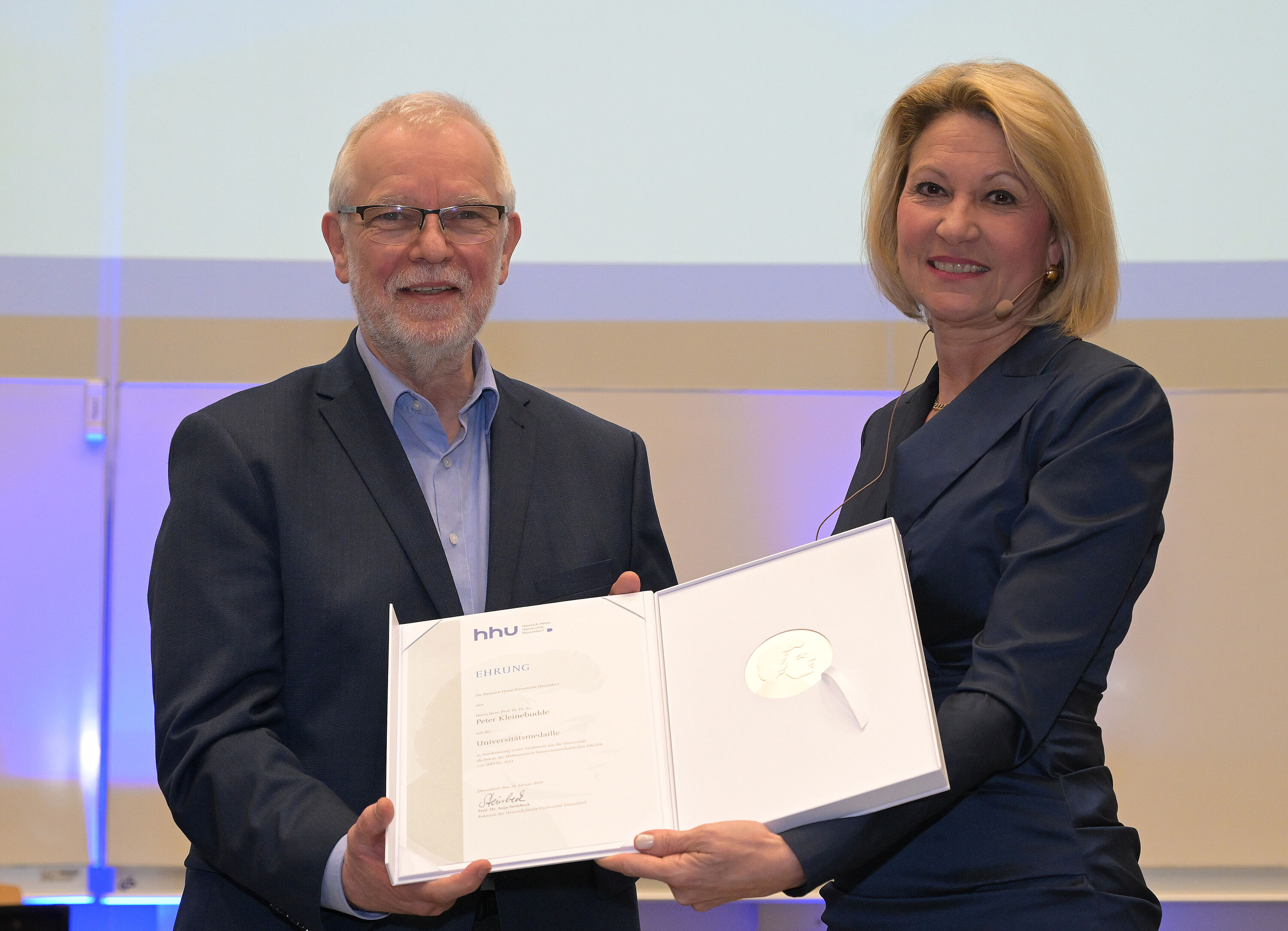 Im Anschluss an ihre mit auffällig großem Applaus bedachte Rede verlieh die Rektorin in Anerkennung seiner Verdienste Univ.-Prof. Dr. Dr. h.c. Peter Kleinebudde (Dekan der Mathematisch-Naturwissenschaftlichen Fakultät von 2019 bis 2023) die Universitätsmedaille.