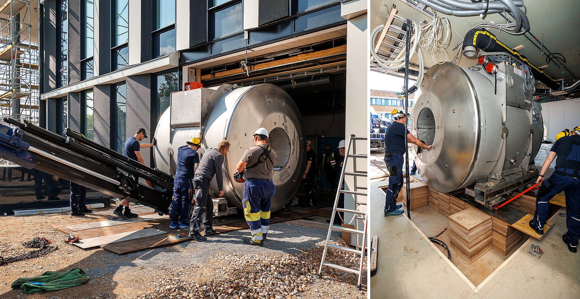 Die Bildgebung ist ein zentrales Werkzeug, um die Forschungsfragen am CARDDIAB anzugehen. Nun wurden zwei zentrale Geräte dafür, ein 3-Tesla-MRT und ein 7-Tesla-MRT, in das noch im Bau befindliche Gebäude eingebracht. Um sie in die im Erdgeschoss angesiedelte „Imaging Core Unit“ zu bringen, wurden extra Fassadenteile entfernt.