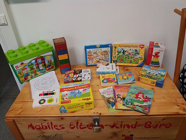 Eine Ausleihe der Mobilen Eltern-Kind-Büros ist kostenlos nach voriger Absprache mit dem FamilienBeratungsBüro möglich. Das Material kann für alle Altersklassen von 0-8 Jahren zusammengestellt werden.