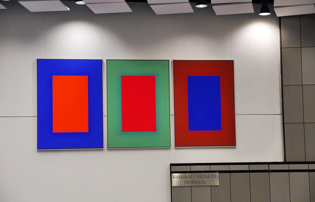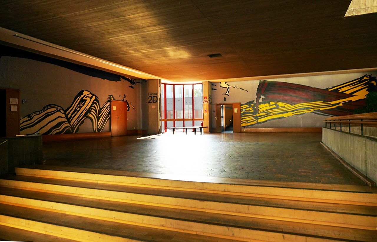 Ursprünglich (in den 1960ern) erfolgte selbst die Anlage des gesamten Universitäts Campus und seiner damaligen Gebäude durch den Landschaftsarchitekten Georg Penker als eine Art Gesamt-Kunstwerk in Anspielung auf die rheinischen Landschaften mit Tälern, Terrassen, Fluss, Dämmen und Wellenlinien.