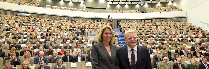 Der ehemalige Bundespräsident Joachim Gauck übernahm die Heinrich-Heine-Gastprofessur 2018. Diese führte ihn für drei Termine an die Heinrich-Heine-Universität Düsseldorf.
