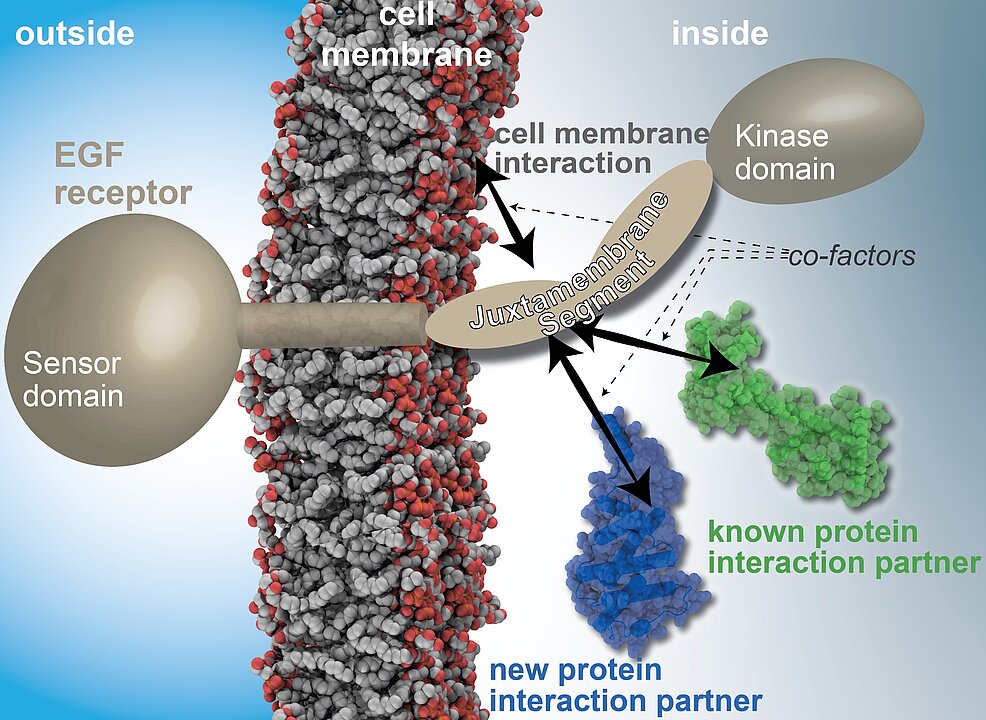 The EGF receptor additionally comprises one other domain: the juxtamembrane (JM) segment between the external sensory domain and the kinase domain. We know that molecules also interact with this segment and can influence the transmission of signals as a result. But so far we know very few interaction partners. It is also unclear exactly how these interactions take place.