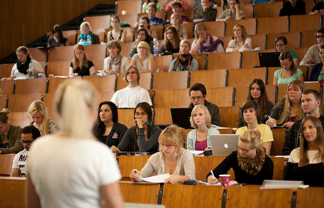 In general, face masks must be worn in HHU buildings and lecture halls. Lecturers are not required to wear face masks while teaching. Face masks can be removed while seated, provided that a minimum distance of 1.5 metres from other people can be maintained. Mask wearing is also required outdoors in cases where it is not possible to comply with social distancing rules. This applies especially to queues that may form at the beginning of the semester in particular.
