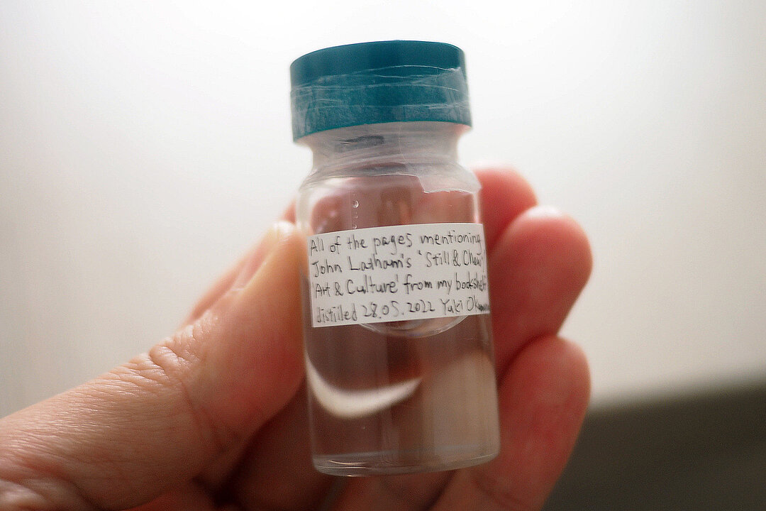Okumura reactivated the 30 processes almost entirely on his own as an attempt to connect the 30 artists through "my living body here and now as a common agent", according to Okumura. Of these, John Latham's (1921-2006) 1966-1969 work "Art and Culture" was reworked by the artist together with HHU junior research group leader Dr. Bernd M. Schmidt from the Institute of Organic Chemistry and Macromolecular Chemistry in the Düsseldorf chemistry labs.