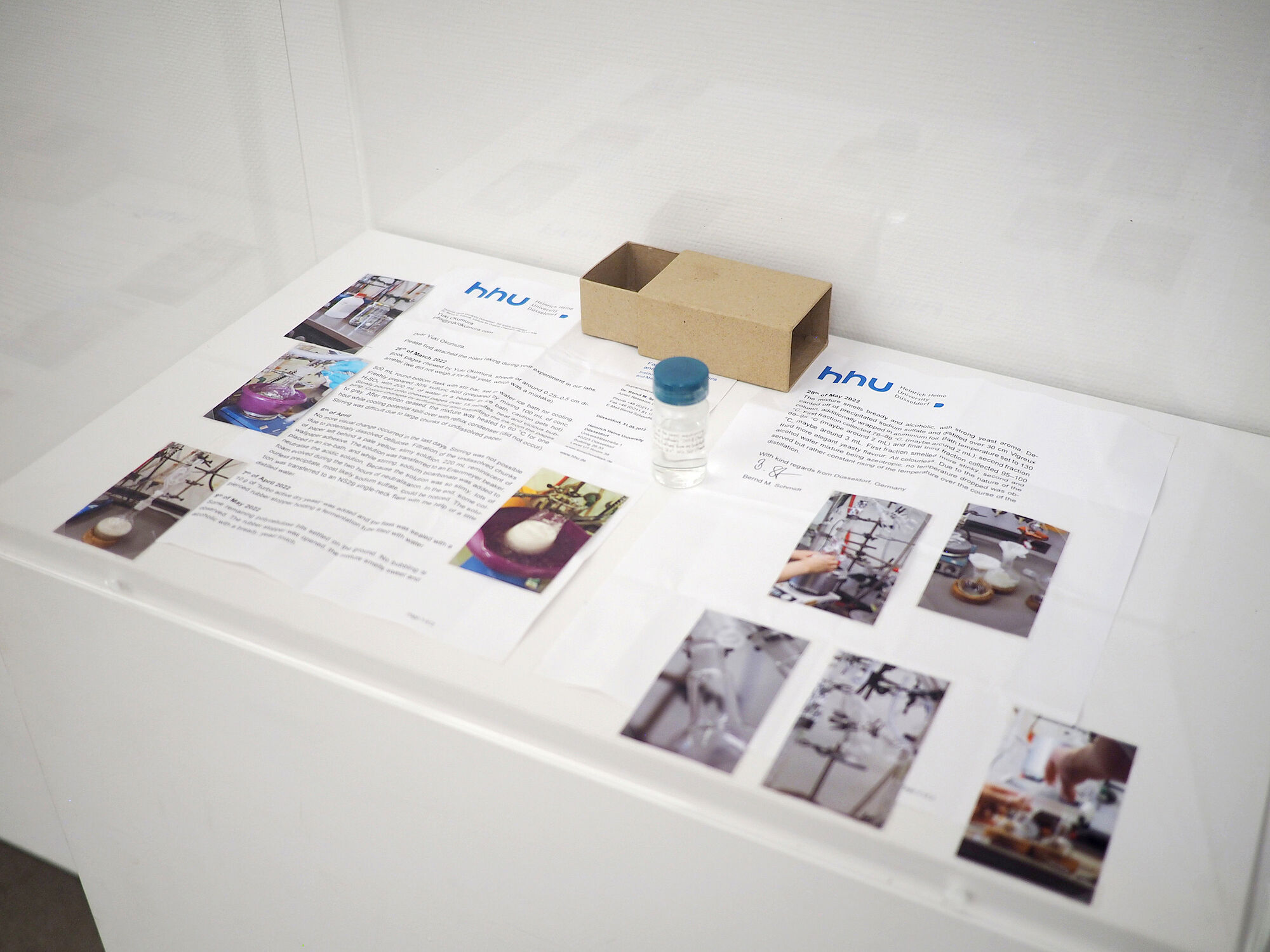 The end result was a laboratory vessel with a clear alcoholic liquid that smells bread-like and yeasty. Okumura is exhibiting this vessel together with a detailed lab report with HHU logo and photos of the creation process in a showcase at the Triennale. It stands in an ensemble with other elements that have also emerged from the artist's reinterpretations of other works from the 1969 exhibition.