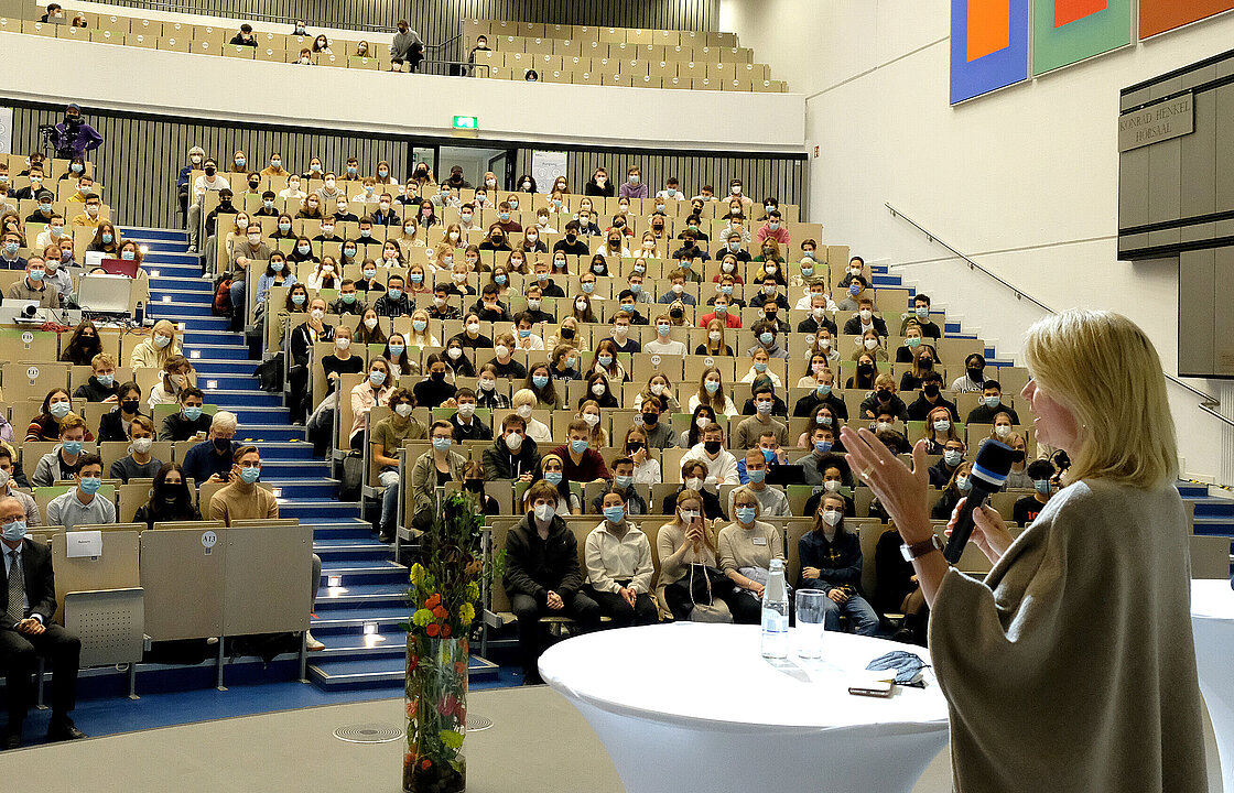 Vice President Prof. Börner was likewise visibly pleased to finally be back in a busy lecture hall: “Our safety and access concept allows for a semester with a lot of in-person teaching. Our lecturers will also provide students with additional online offerings where possible. HHU is ready to hit the ground running with its hybrid teaching concept. Rest assured that we will make adjustments as necessary throughout the semester to ensure that you have a good and a safe start to your studies.”