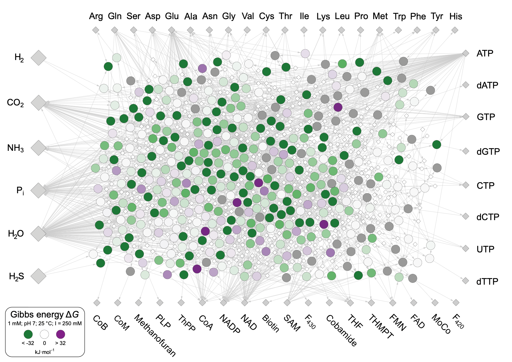 When asked about the motivation behind the central question of the new study, Jessica Wimmer says: "We wanted to know where the energy came from that drove primordial metabolism forward. At the very onset of metabolic reactions some 4 billion years ago, there were no proteins or enzymes to catalyze reactions because they had not yet evolved. Metabolism had to arise from reactions that could take place in the environment, perhaps with help from inorganic catalysts. But catalysts or not, in order to go forward, the reactions have to release energy. Where did that energy come from? There have been lots of suggestions for possible sources of metabolic energy in the literature. But nobody ever looked into the reactions of metabolism itself." To find sources of energy in metabolic reactions, the team calculated the amount of free energy, also called Gibbs energy, that is released or consumed in each reaction.