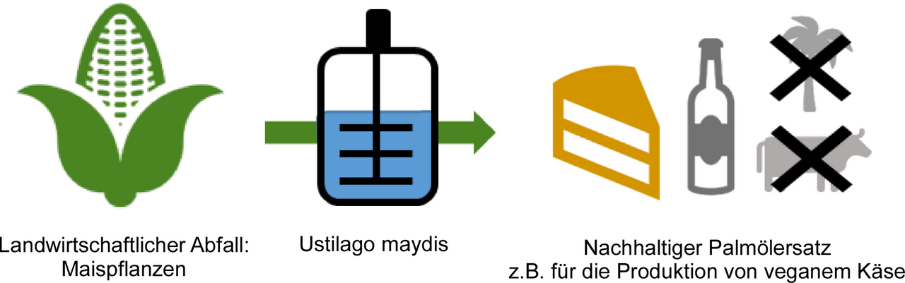 Using the fungus Ustilago maydis, the researchers have found a way to produce a microbial oil which closely matches palm oil – i.e. it has a similar composition of fatty acids, which determine its properties – meaning that it is likely to be suitable for use in food. In the course of the project, the aim is to establish the fermentation of corn stover – which cannot be eaten or used as animal feed – on a large scale.