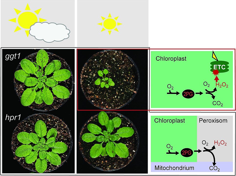 The object of the study was thale cress (Arabidopsis thaliana), whereby the genes for HPR1 and GGT1 were switched off in some of the plants (so-called knockout plants). These genes encode two key enzymes for photorespiration, which can be found at different points along this metabolic pathway. The plants were exposed to different light conditions: fluctuating light and constant light at two intensities.