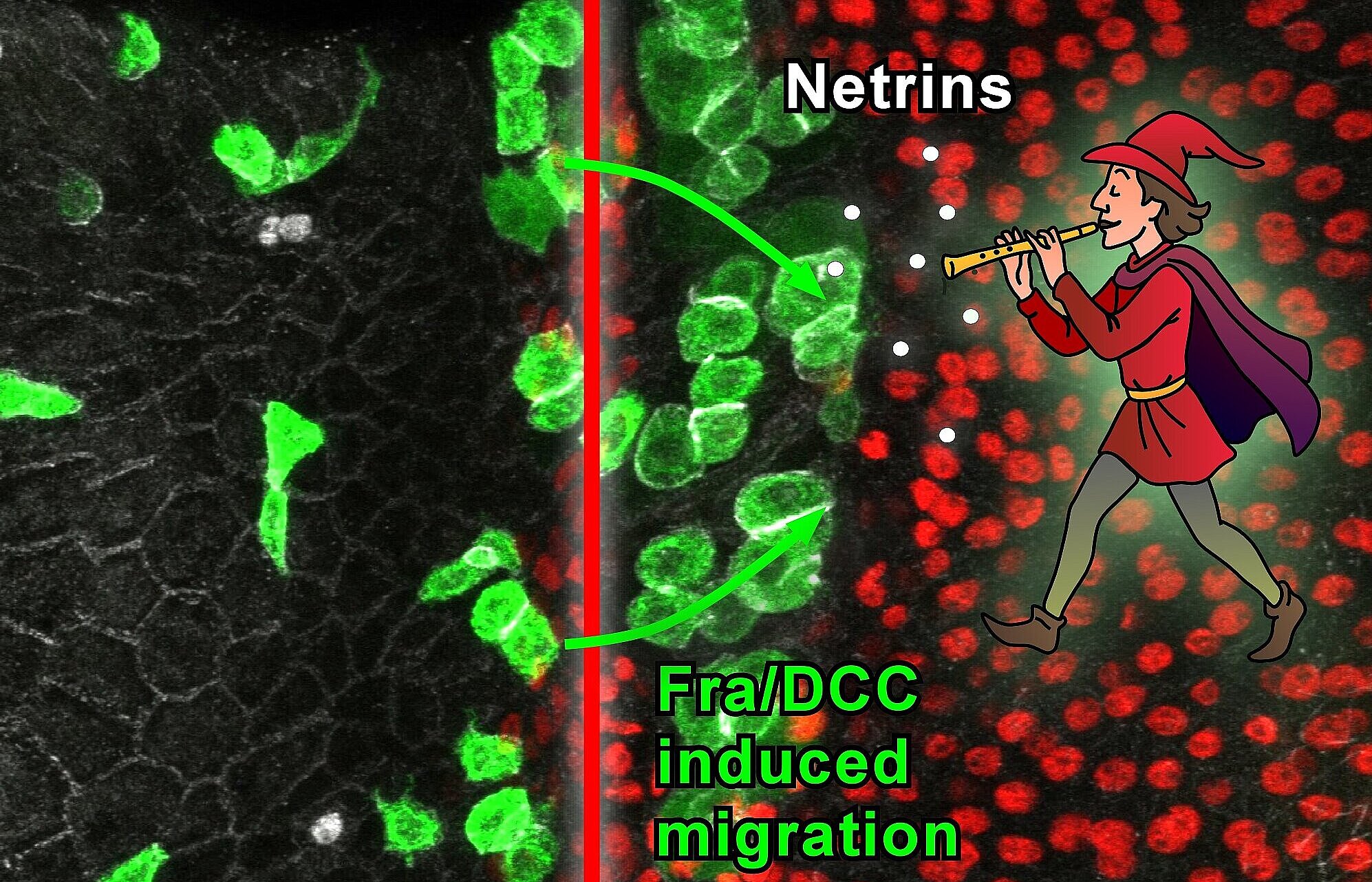 The newly developed Hamelin Assay shows how Netrin molecules (white dots) induce the migration of cancer cells through organ boundaries (red line) via the Fra/DCC receptors in intestinal stem cells (green cells). The rat-catcher blowing the Netrins out of his pipe symbolises how the disseminated cancer cells move through the body to form subsequent metastases. (Image: HHU/Tobias Reiff)