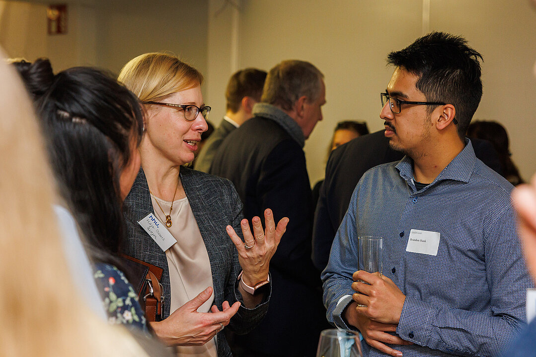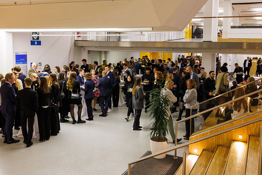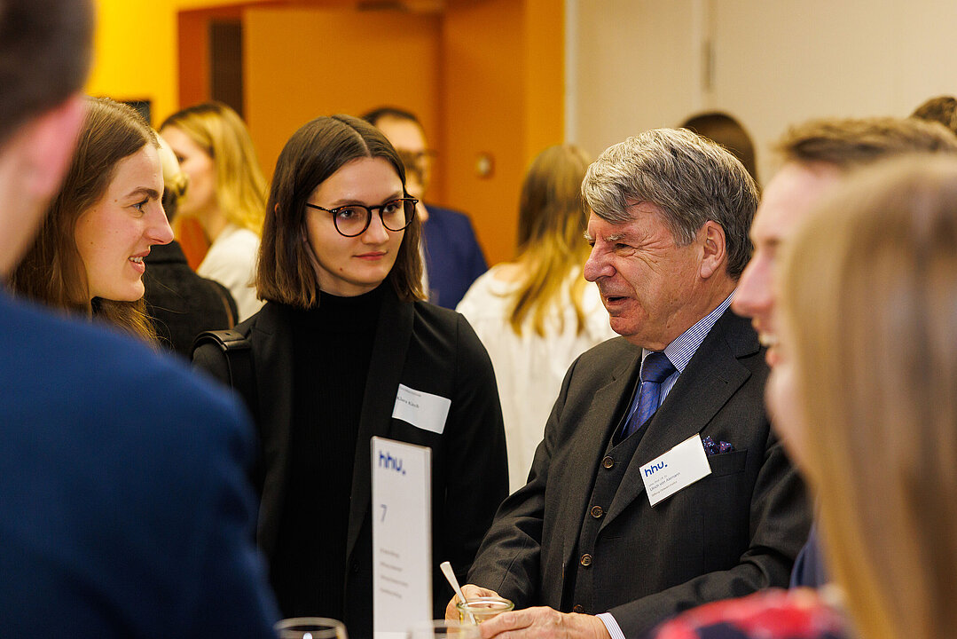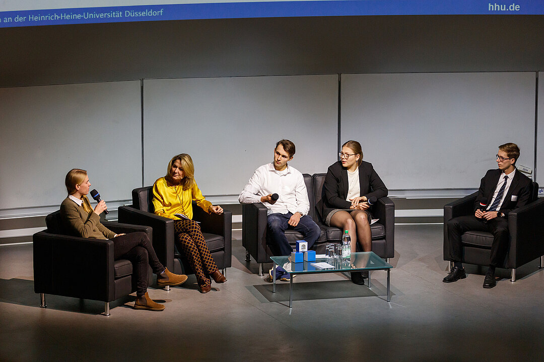 This year, acting as representatives of all current scholarship holders, four students took part in an on-stage panel discussion with President Professor Anja Steinbeck and provided an insight into their achievements to date, motivation behind their studies and interests. Tobias Vehling has already completed a degree in finance (Diplom-Finanzwirt) and has now begun a law degree, majoring in tax law. Julius Höner is in the seventh semester of his biology degree. The scholarship enables him “to develop ideas for practical nature conservation such as the restoration of a bog habitat and purchase new research equipment.” Nina Liebrand has a full calendar – alongside her activities as a competitive athlete, she is studying molecular biomedicine and computer science at master’s level. New student Katharina Steeger chose HHU “because the financial and actuarial mathematics study programme is only offered here” and volunteers as a presbyter in her spare time.