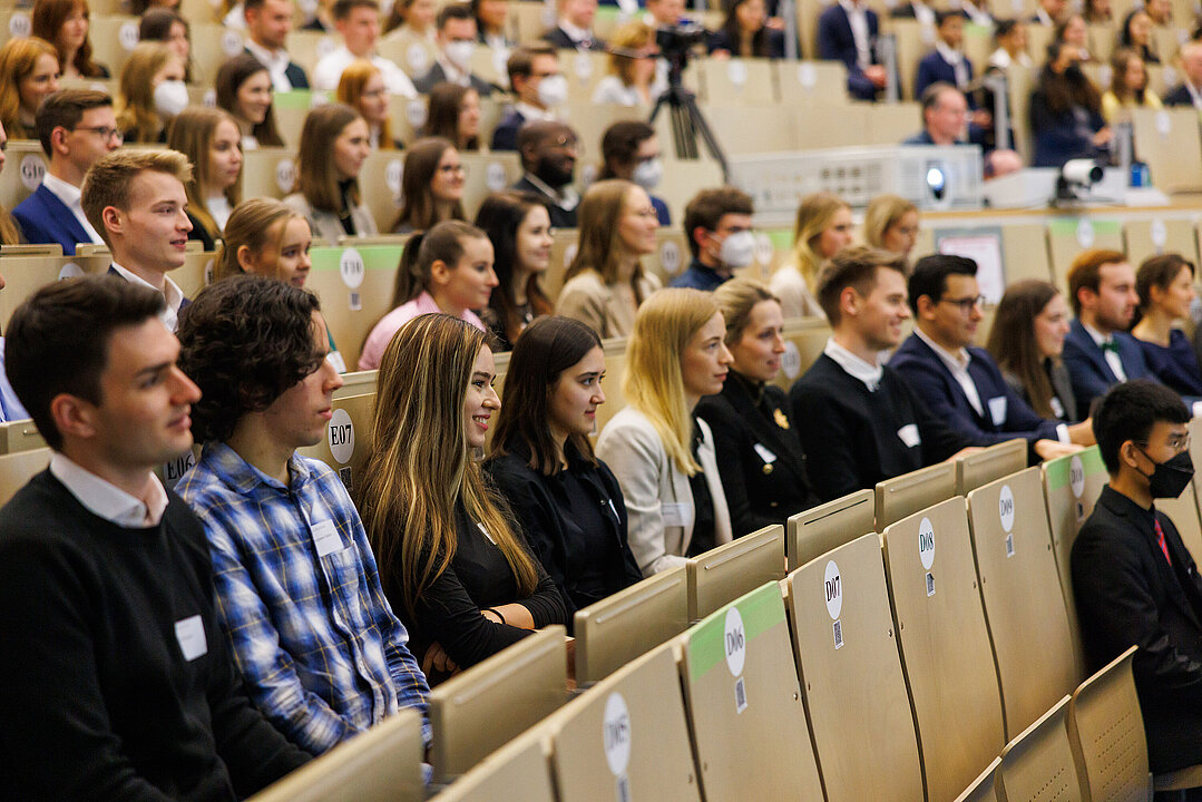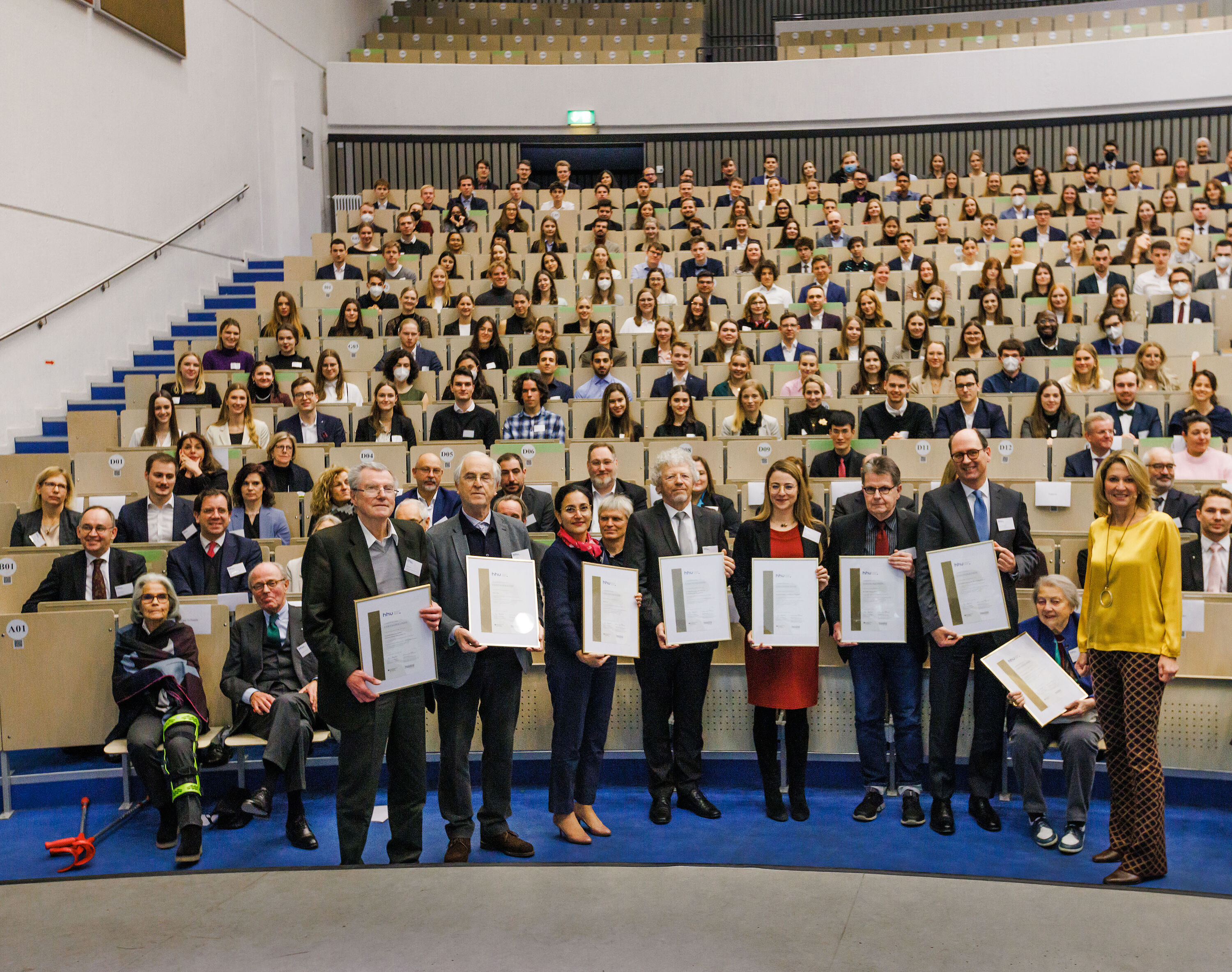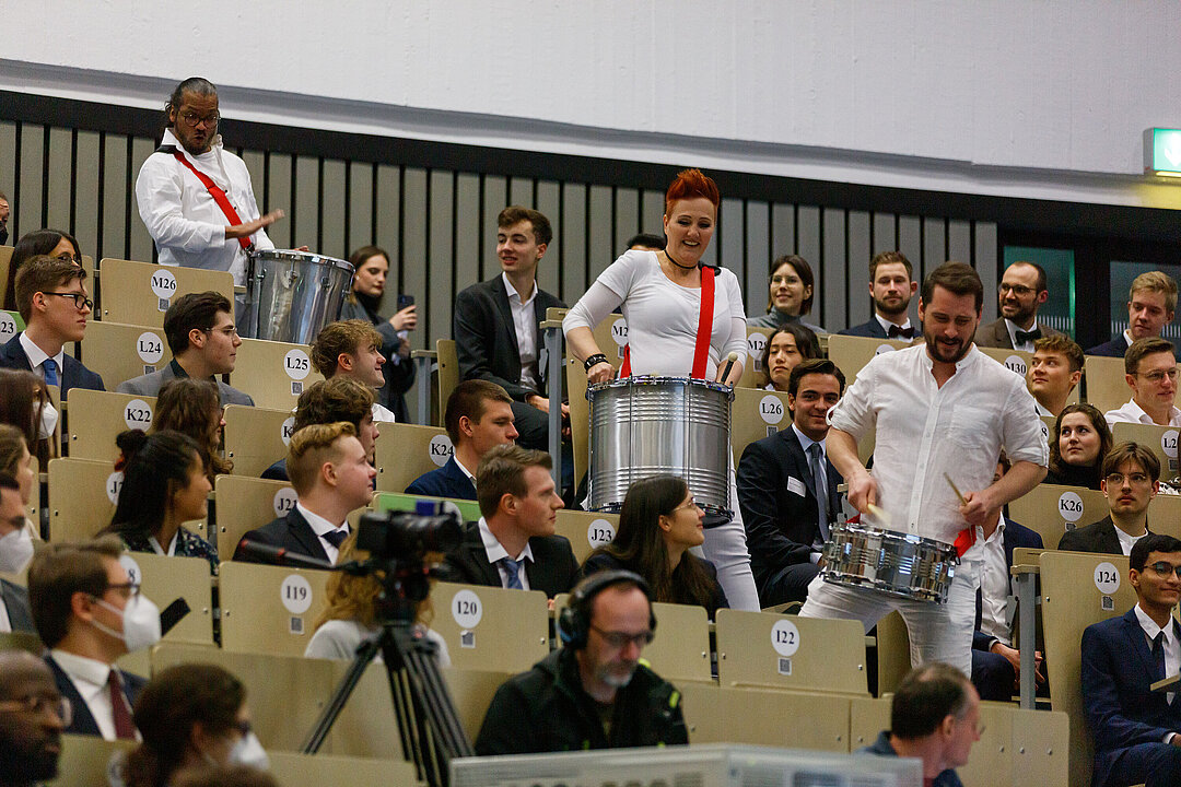 This year’s award ceremony, which was held in lecture theatre 3A on 14 December, got going with a bang: In the spirit of Heine, who urged people to bang the drum, the percussion trio “beats and noises” helped participants get into the swing of things – with good reason: In the current funding year, 85 donors (private donors, foundations and companies) have provided financial support of more than EUR826,000 to a total of 459 students from all five faculties. The basis of the German National Scholarship programme is the “matching” procedure: The Federal Government doubles every donation received, enabling more than 1.6 million euros in total to be awarded.