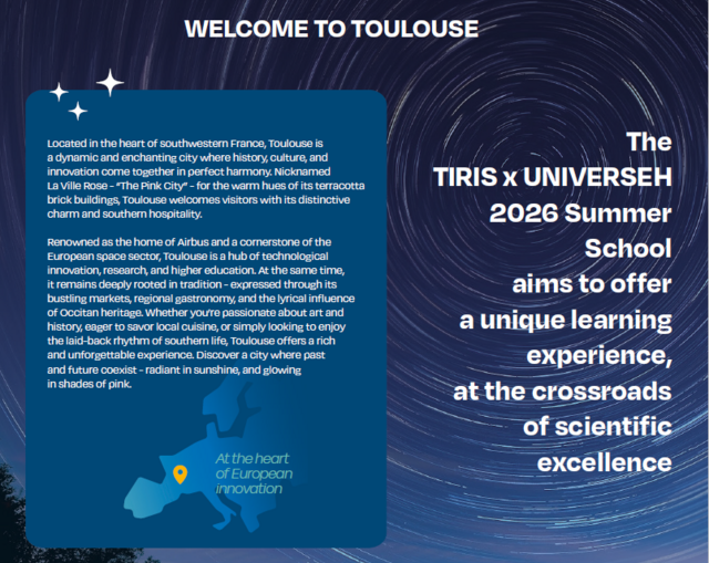 TIRIS Summer School 2026 is part of a unique dynamic, driven by the TIRIS project and supported by UNIVERSEH and the University of Toulouse. By combining science, technology and societal reflection, TIRIS Summer School 2026 aims to train you as tomorrow’s leaders, capable of imagining innovative solutions to climate and space issues.