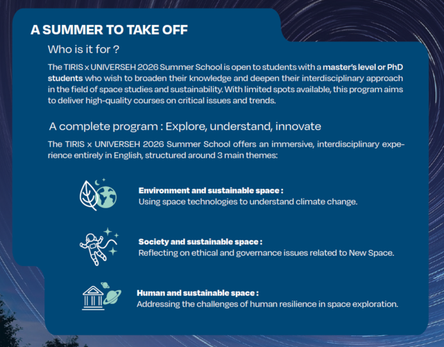 By combining science, technology and societal reflection, TIRIS Summer School 2026 aims to train you as tomorrow's leaders, capable of imagining innovative solutions to climate and space issues.