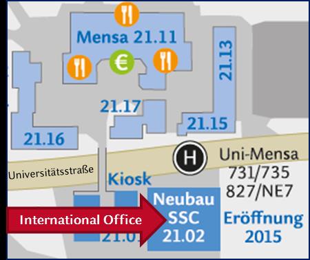 Das International Office finden Sie in Gebäude 21.02 (roter Pfeil). Die nächstgelegenen Haltestellen des öffentlichen Nahverkehrs sind Christophstraße, Universität West und Universität Mensa.