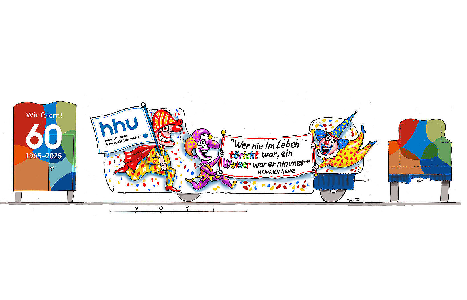 Entwurfszeichnung des HHU-Wagens. Rechts und links wird die Zeichnung jeweils von der Vorder- und Rückansicht des Wagens flankiert. Auf der Rückseite steht: Wir feiern! 60 / 1965-2025. Die Seite des Wagens ist bunt und auf weißem Grund gestaltet. Ein Harlekin trägt eine Fahne mit dem HHU-Logo. Zwei weitere Clowns halten ein Banner mit dem Zitat von Heinrich Heine: Wer im Leben töricht war, ein Weiser war er nimmer." Zoom