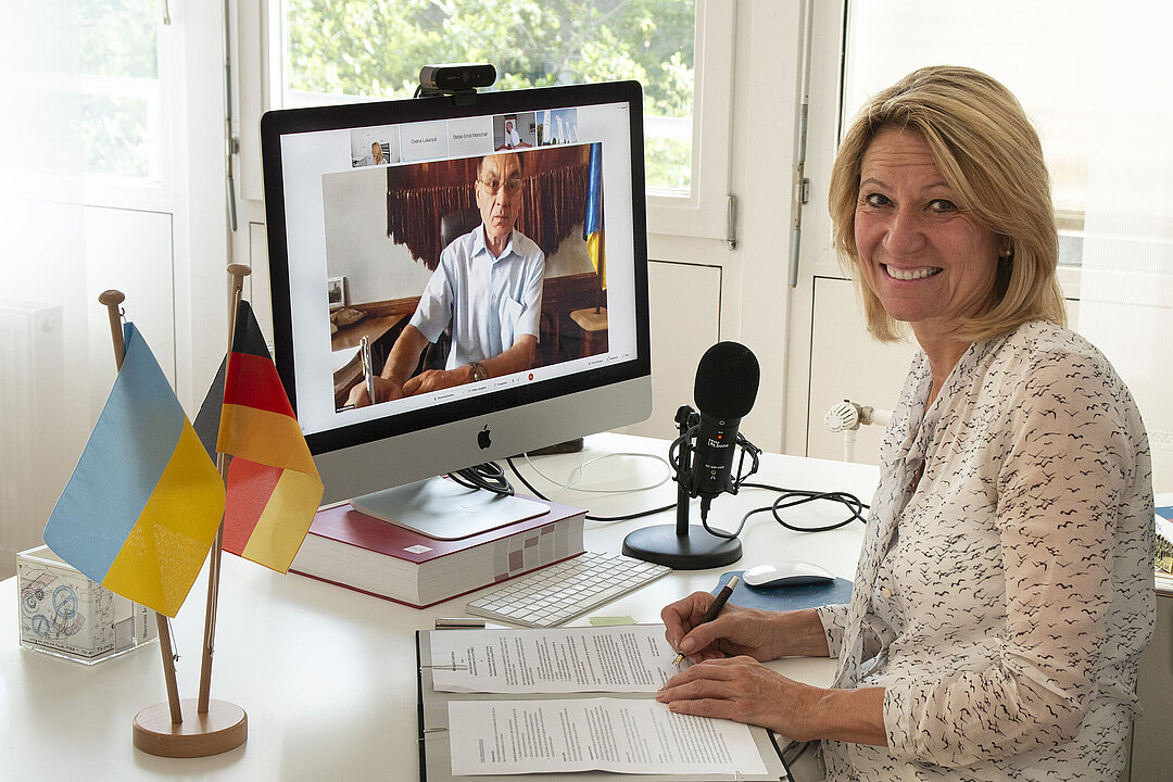 Videokonferenz an der HHU: Rektor Prof. Dr. Roman Petryschyn und Rektorin Prof. Dr. Anja Steinbeck unterzeichnen eine Absichtserklärung über eine ukrainische-deutsche Universitätspartnerschaft. (Foto: HHU/Paul Schwaderer)