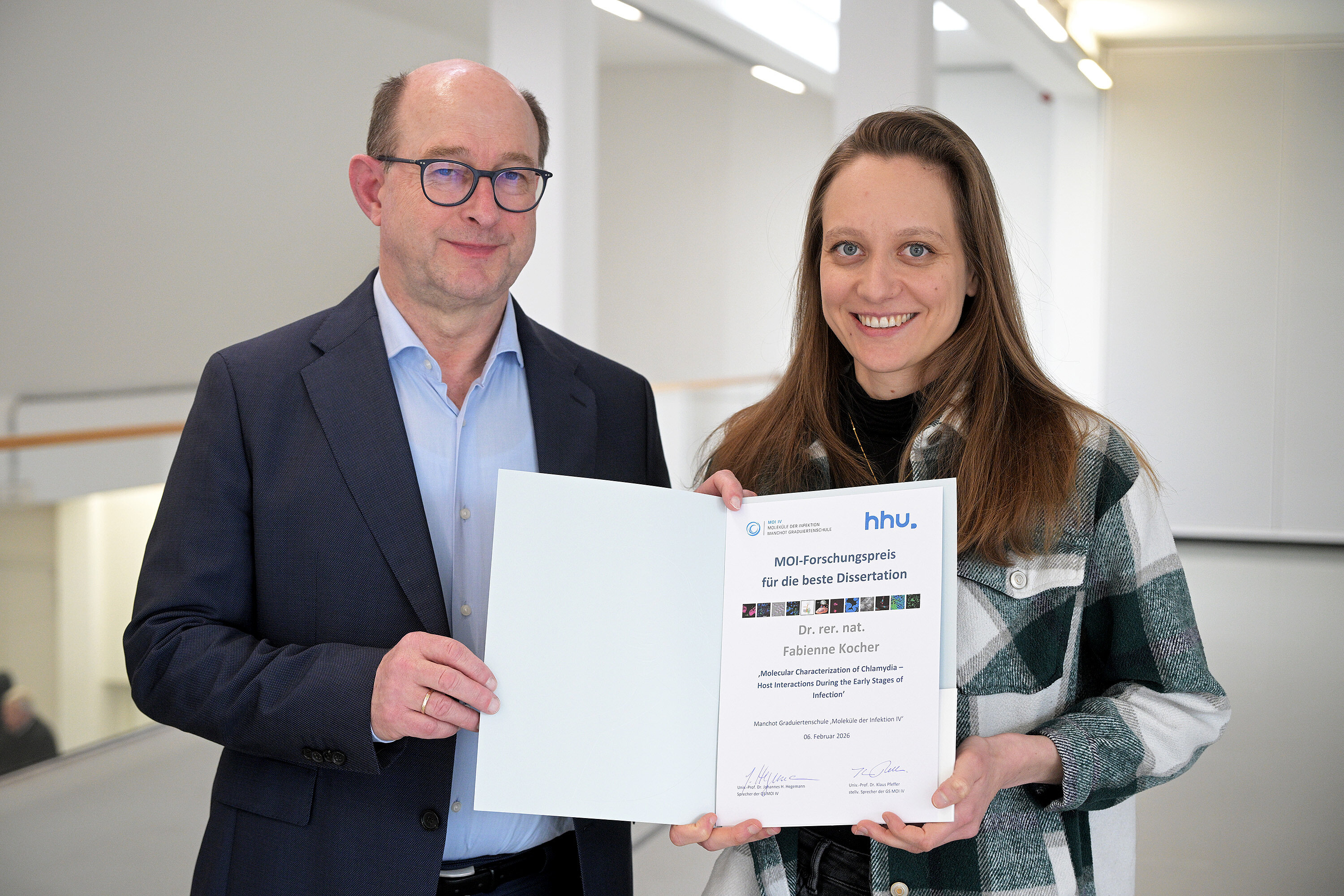 Dr. Fabienne Kocher wurde für ihre Arbeit „Molecular Characterization of Chlamydia – Host Interactions During the Early Stages of Infection“ ausgezeichnet. In ihrer Dissertation untersuchte Kocher die frühen Infektionsprozesse der humanpathogenen Bakterien Chlamydia trachomatis und Chlamydia pneumoniae auf molekularer Ebene. Sie zeigte, wie diese Erreger, die sich nur innerhalb von Wirtszellen vermehren können, spezifische Oberflächenproteine nutzen sowie früh in die Wirtszelle eingeführte Effektorproteine. So binden die Chlamydien gezielt an menschliche Epithelzellen und manipulieren deren zelluläre Strukturen für das Eindringen in die Zelle. Die Ergebnisse der Forschungsarbeit liefern neue mechanistische Einblicke in zentrale Prozesse der bakteriellen Infektion und der frühen Wirt-Pathogen-Interaktion.
