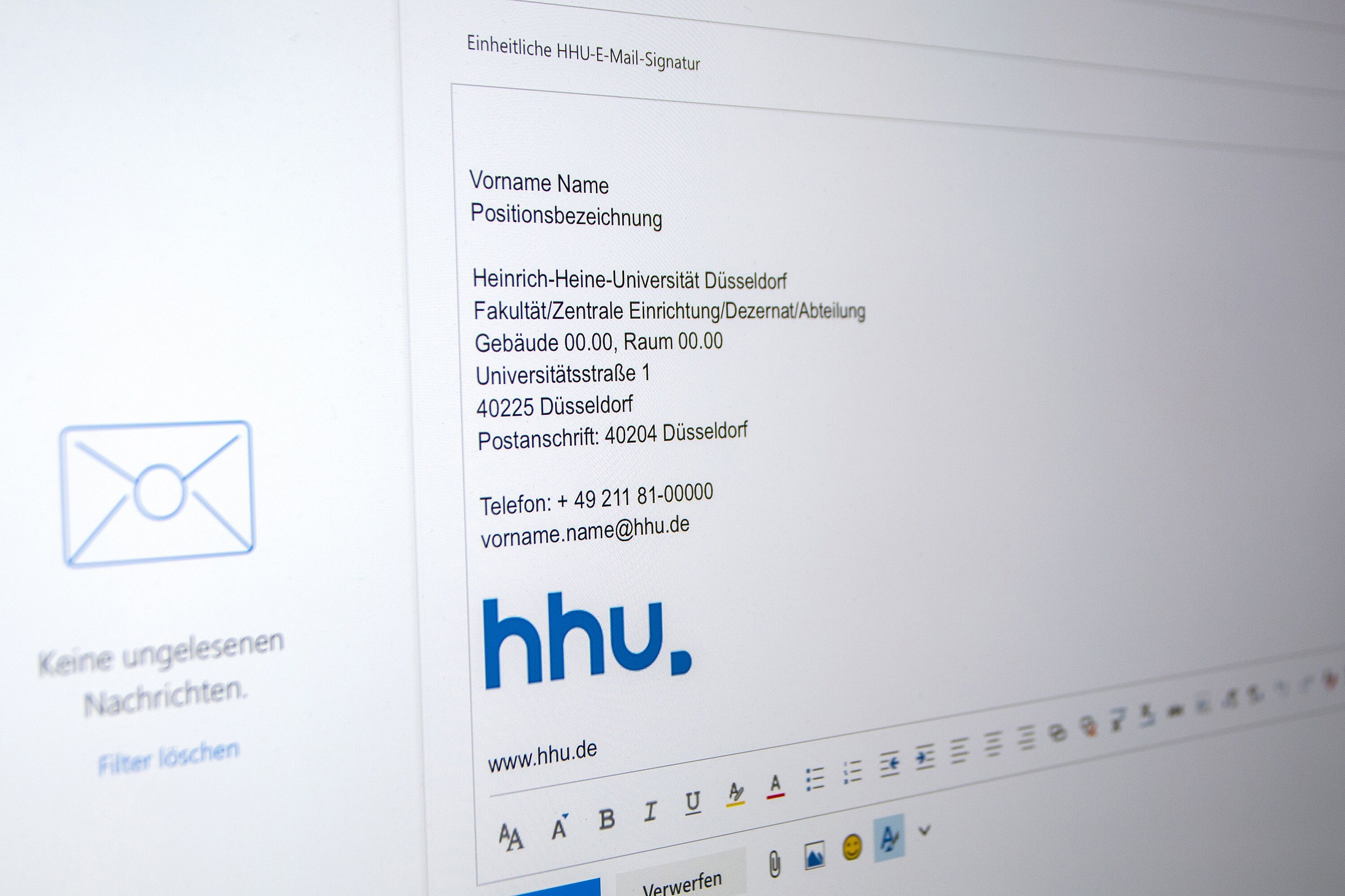 Als Schriftart ist laut Corporate Design für E-Mails Arial Regular zu verwenden und die Signatur sollte möglichst in neutralem Schwarz gehalten sein. Wer das HHU-Logo einbinden möchte, kann dies unter dem Text – und über der Webseite – tun (siehe Foto), möglichst in einer geringen Auflösung, um die E-Mails nicht unnötig zu vergrößern. Eine passende Bilddatei findet sich ebenfalls im Corporate Design-Portal, Direktlink zum Abspeichern.