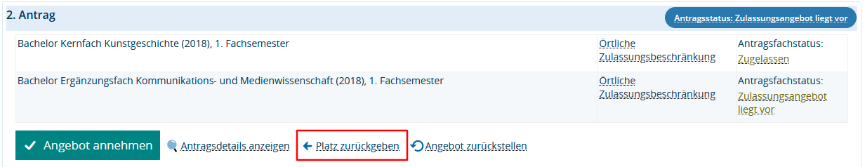 Loggen Sie sich bitte mit Ihren Zugangsdaten im Bewerbungsportal ein. Klicken Sie am entsprechenden Antrag auf die Schaltfläche Platz zurückgeben: