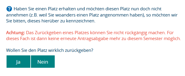 Falls Sie einen Zulassungsbescheid erhalten haben, den Studienplatz aber mit Sicherheit nicht annehmen werden, geben Sie diesen bitte schnellstmöglich frei. Der Platz kann dann noch an nachrückende Berwerber*innen vergeben werden. Beachten Sie, dass hierbei der Anspruch auf Ihren Studienplatz für das betreffende Fach im beantragten Verfahren unwiderruflich verfällt.
