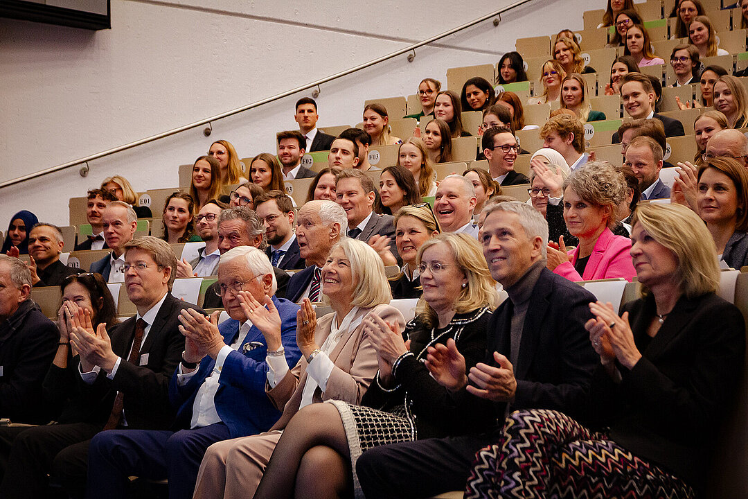 Weihnachten naht, und auf der Stipendienfeier an der Heinrich-Heine-Universität Düsseldorf (HHU) war das besonders spürbar. Unsere zahlreichen Gäste wurden von festlich geschmückten Tannenbäumen begrüßt. Auch in diesem Jahr konnte die HHU wieder auf ihre großzügigen Förderer zählen: mit 441 Stipendiaten und Stipendiatinnen im Deutschlandstipendium haben wir erneut den Spitzenplatz unter allen NRW-Hochschulen erreicht! Am 11. Dezember 2024 wurden drei unserer 95 Fördernden mit einer Ehren-Stifterurkunde für ihr 10jähriges Engagement ausgezeichnet: Die BürgerStiftung Düsseldorf, die Firma Qiagen und HHU-Rektorin Prof. Anja Steinbeck und ihr Ehemann Dr. Thomas Menke. Auch auf unsere leistungsstarken Stipendiatinnen und Stipendiaten können wir stolz sein. Sie gehören zu den jeweils besten 5 – 10 % ihrer Studiengänge. Weil die HHU aber auch besonderen Wert auf Chancengleichheit legt, gingen 70 der Stipendien an studierende Eltern oder Bewerberinnen und Bewerber aus bildungsfernen Elternhäusern. „Wir möchten allen Studierenden faire Bedingungen schaffen“, betonte Steinbeck. Im Hörsaal unterhielt dieses Mal der Beatboxer Marvelin die Gäste und Sophie Rhinow moderierte das Programm. Im Anschluss beim Get Together gab es für die Fördernde und Studierende die Möglichkeit, sich bei Fingerfood und Getränken kennenzulernen und auszutauschen.