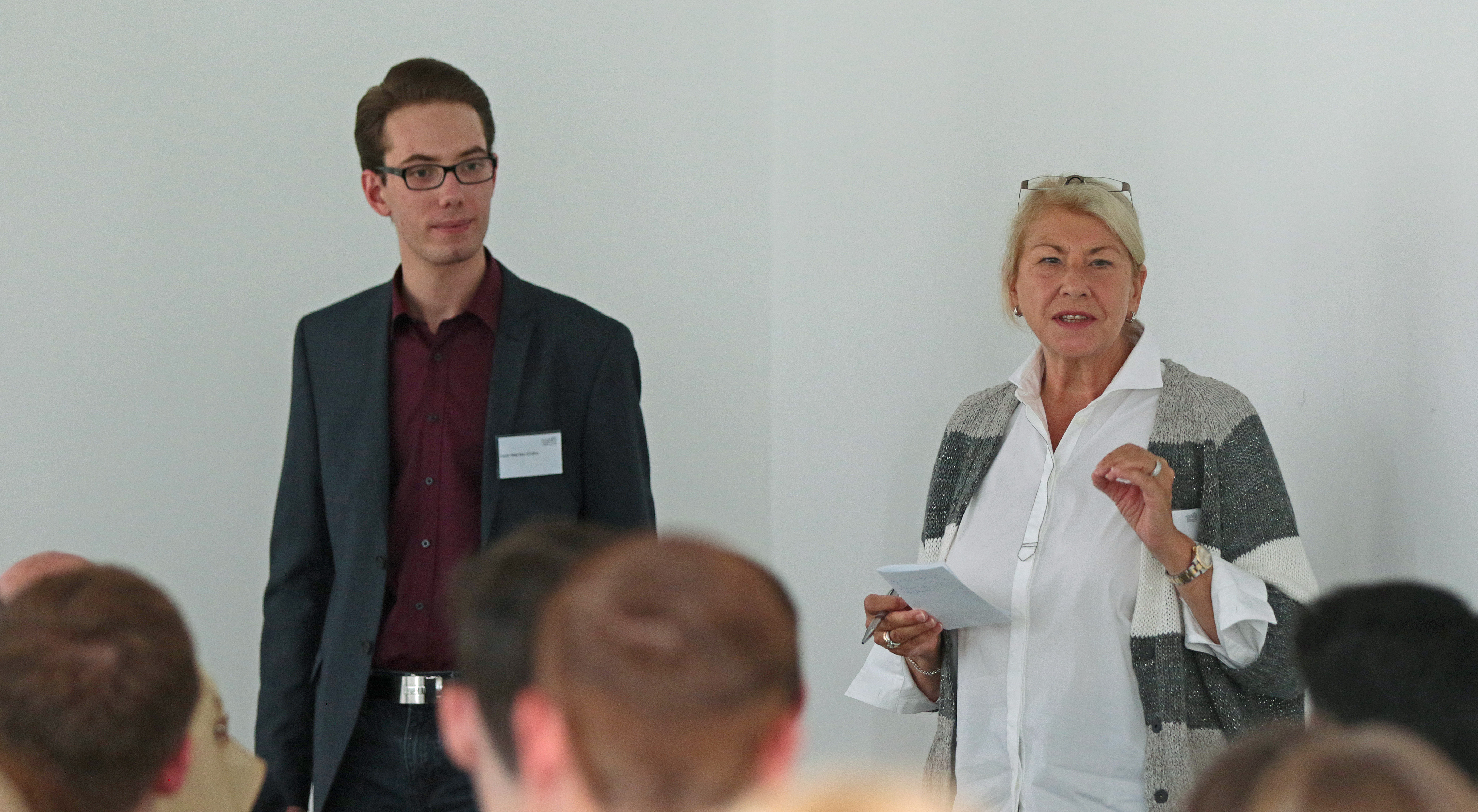 Sie berichtete über ihren bisherigen Ausbildungsweg als positive „Odyssee“ – eine lange abenteuerliche Reise. Dem Freiwilligen Sozialen Jahr im kulturellen Bereich folgte ihr Erststudium der Kunstgeschichte und Soziologie, während dessen sie das Latinum und Graecum absolvierte. Ihrem bestandenen Bachelorabschluss folgte ein Praktikum der völlig anderen Art: die Reitschule für barocke Reitweise war der extreme Kontrast zu Architekturbeschreibungen, Kunstrezeption und Grammatik. Begeistert von ihren Spracherfahrungen im Erststudium entschied sie sich für ein Zweitstudium der Fächer Latein und Germanistik - zunächst in Wuppertal, nun an der HHU Düsseldorf. Für sie bedeute studieren ein großer, persönlicher Gewinn. Interesse und Leidenschaft gehen dabei einher mit der individuellen Wertsteigerung für den Arbeitsmarkt. Dieser Prozess der Reife beinhaltet jedoch auch den Faktor Zeit. Das ist der kritische Aspekt dieses Weges: den (selbstgemachten) Zweifeln bezüglich optimiertem Lebenslauf, Konkurrenz auf dem Arbeitsmarkt, geisteswissenschaftlicher Breitenqualifikation im Kontext von beschleunigten Entwicklungen in Arbeitswelt und Gesellschaft Stand halten zu müssen. Wünschenswert sei es, innerhalb der Normen der Gesellschaft auch subjektive Strategien der Odysee sinnvoll einzubauen, Ideen zu Veränderungen in dieser Hinsicht aufzugreifen. Sie zitierte ihren Kommilitonen, der sagte, „das Leben ist nicht die Generalprobe, sondern die Aufführung“.