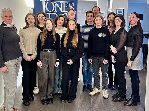 Die Jones Day Foundation fördert seit mehreren Jahren an der Heinrich-Heine-Universität Düsseldorf Geflüchtete aus der Ukraine. Am 6. Februar 2025 waren 11 Stipendiaten und Stipendiatinnen aus dem Deutschlandstipendium und der Förderlinie „Perspektiven“ gemeinsam mit Stefanie Folke-Sabel aus der HHU-Stabsstelle VMSF in die Düsseldorfer Kanzlei-Niederlassung von Jones Day eingeladen.